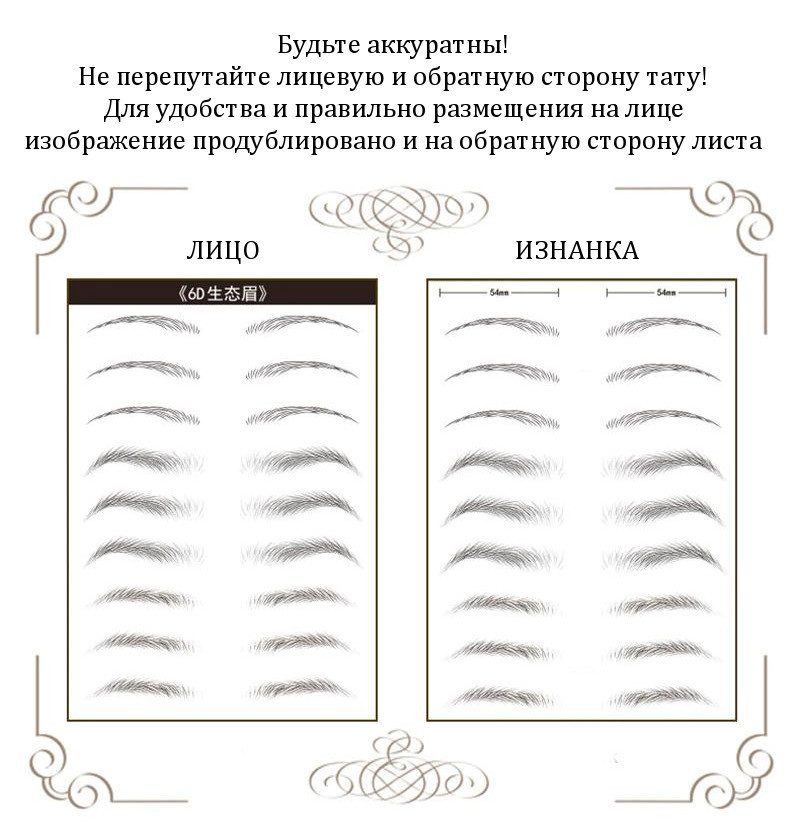 4. Будьте внимательны при определении лицевой и обратной стороны тату. Для удобства правильного расположения бровей на лице их изображение продублировано на обратную сторону листа. Обратите внимание на изображения ниже.