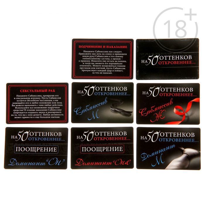 Для начала распределите роли и вручите друг другу по контракту. Кто-то из вас будет доминантом, а другой — сабмиссивом. Разыграйте один из жарких ролевых сценариев. А после решите, поощрения или наказания заслуживает сабмиссив. Вытягивайте карточки из соответствующих колод и воплощайте все фантазии в жизнь! А испытать наивысшее наслаждение от игры вам помогут горячие аксессуары.