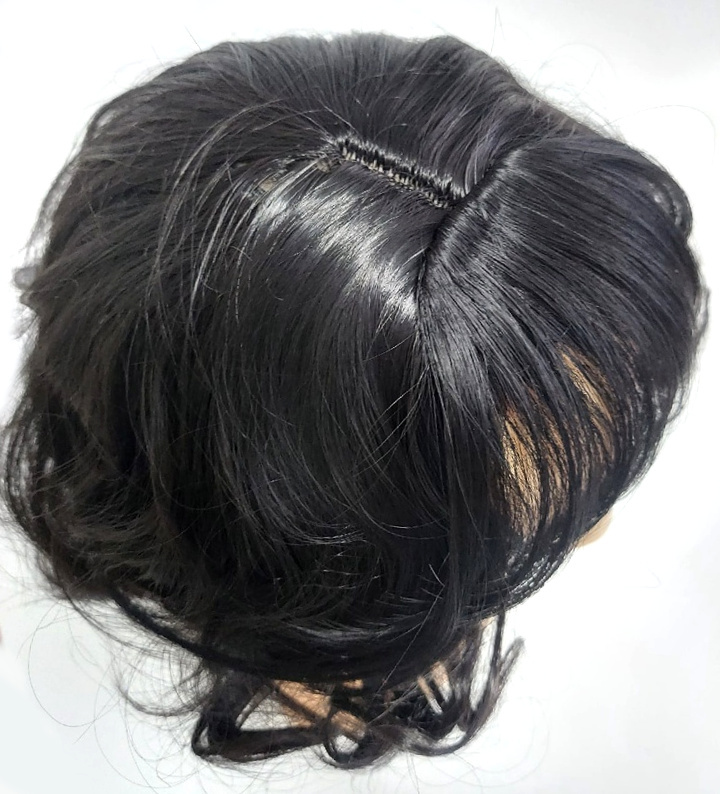 6. Если на внутренней шапочке есть специальные гребешки, то воспользуйтесь ими для дополнительной фиксации парика. Для этого заправьте гребешки в свои волосы (если позволяет из длина), под сетчатую шапочку или под повязку (если Вы их использовали).