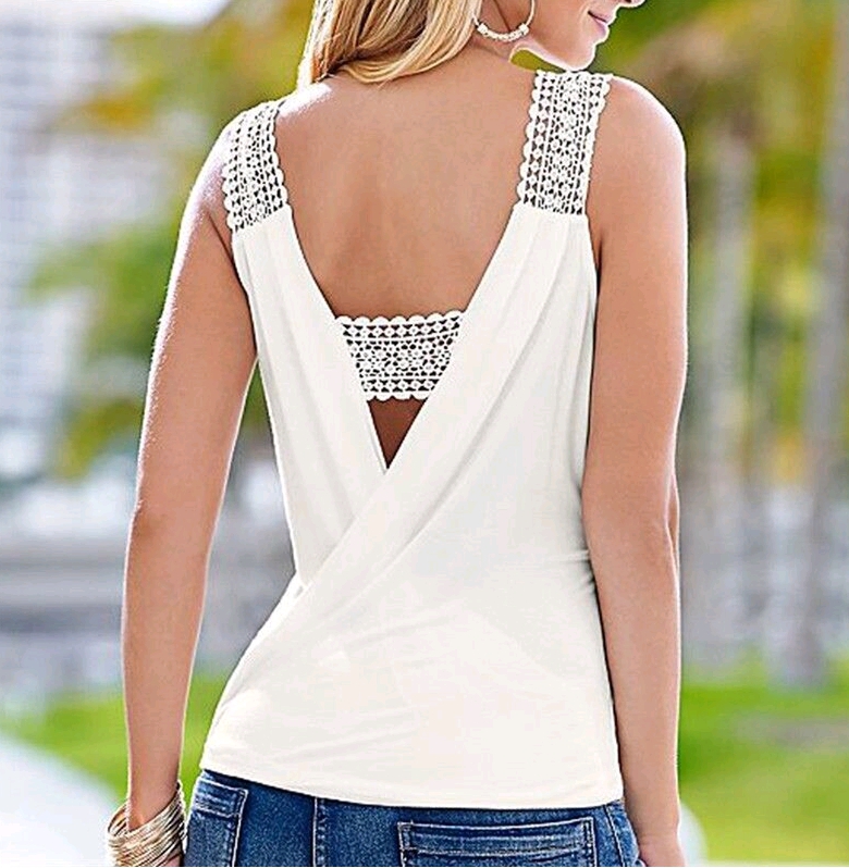 Белая майка с открытой спиной на кружевных лямках.