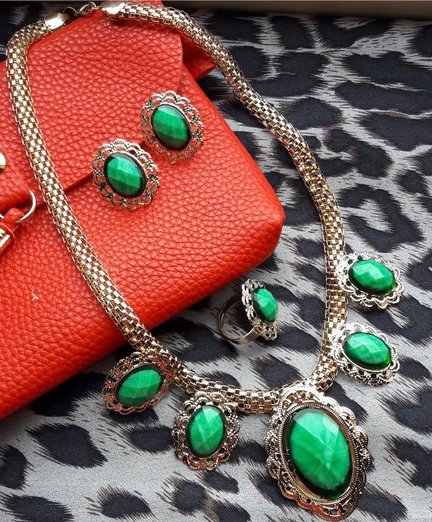 В комплекте: колье, безразмерное кольцо, серьги-гвоздики