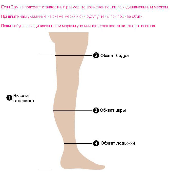 высота голенища от пятки, обхват бедра, обхват икры, обхват лодыжки.