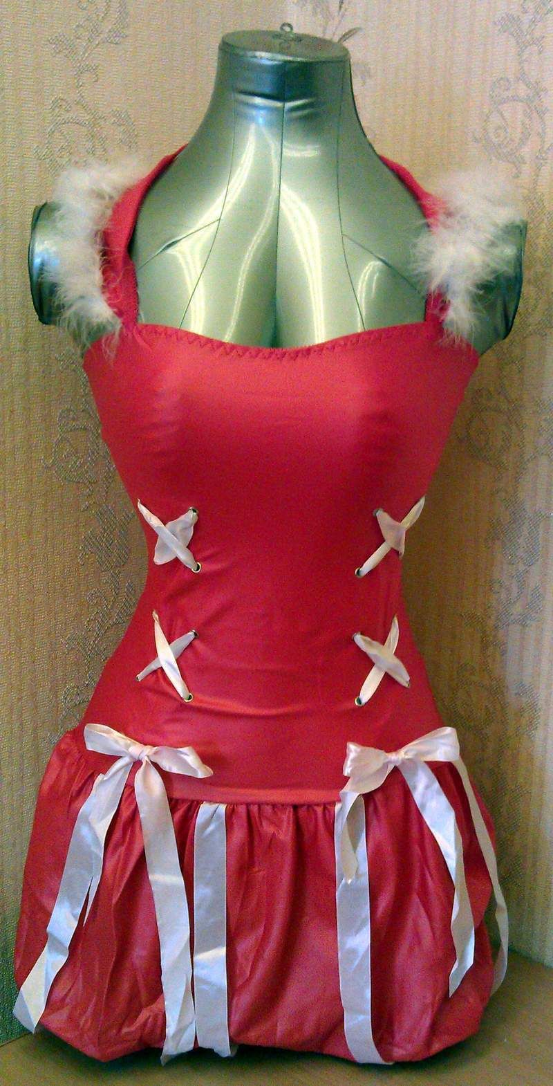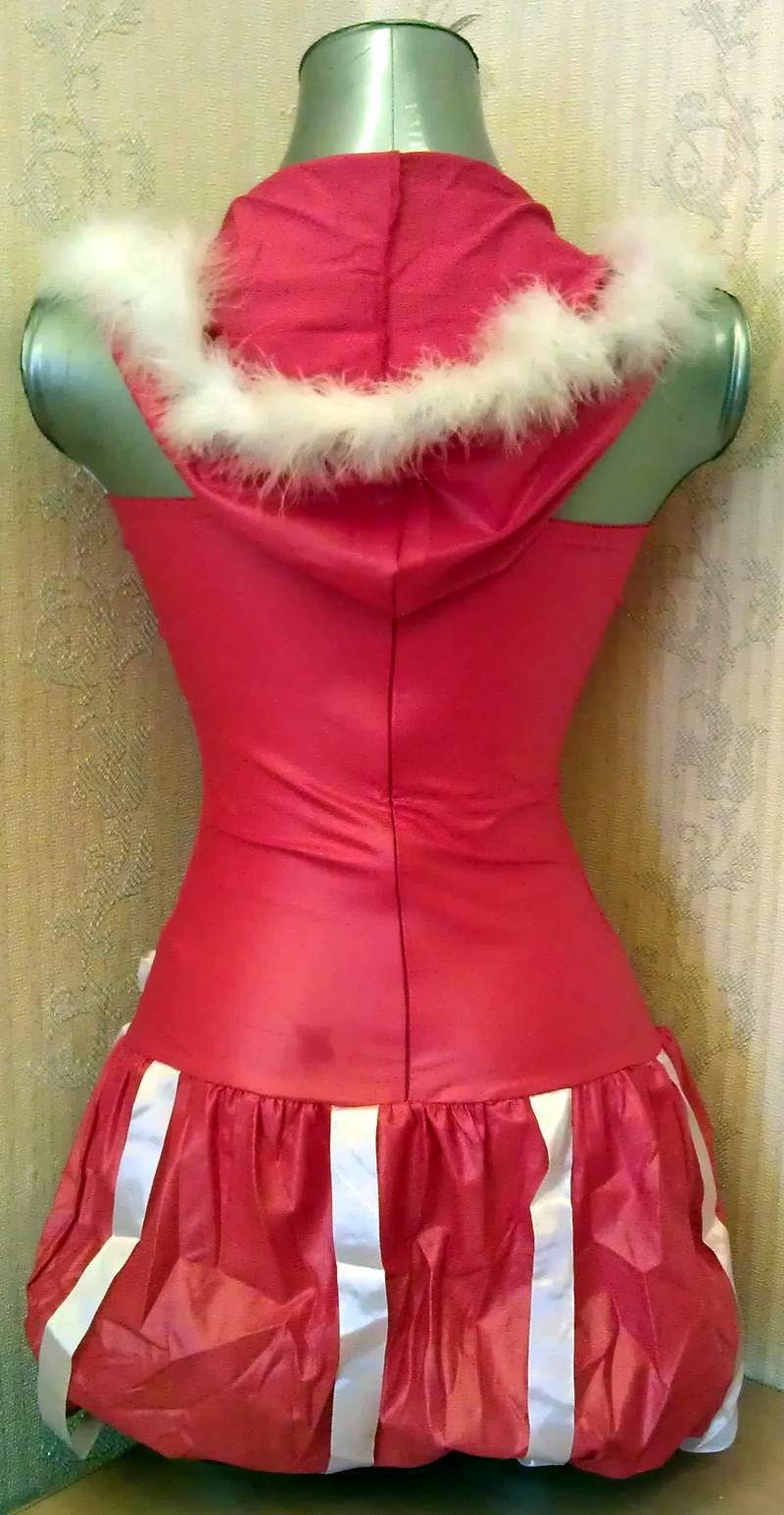 Карнавальное платье с капюшоном. Украшено пухом и атласными лентами.