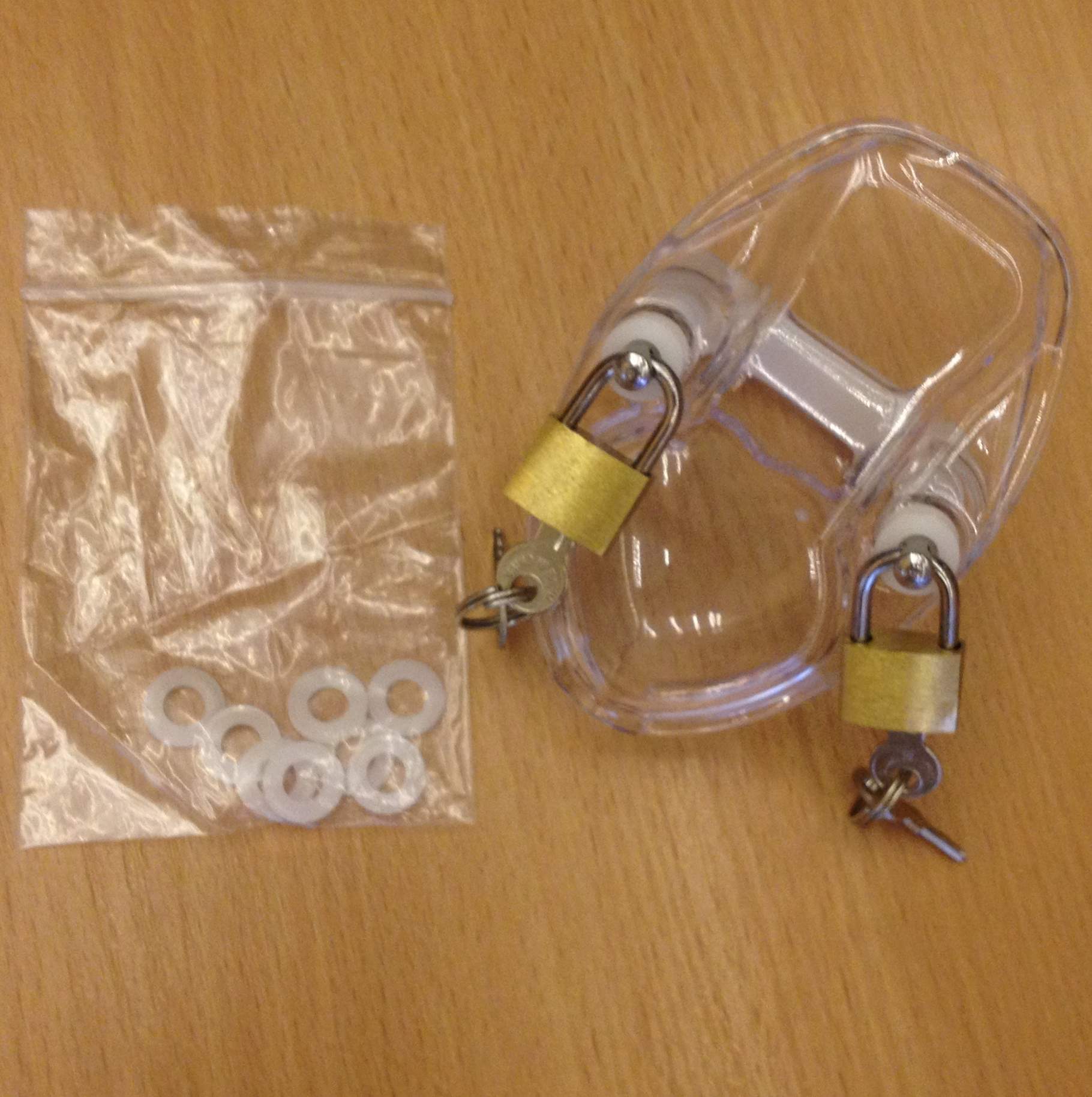 - дистанционные шайбы - 14 штук (позволяют регулировать силу сжатия члена и размер отверстия под мошонку между фиксирующей скобой и клеткой)